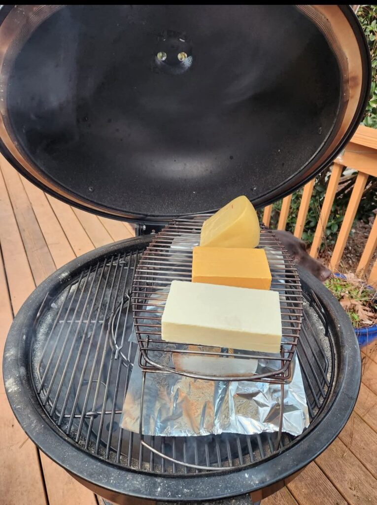 When you are ready to smoke your cheese, it is important to remember to factor in ambient temperature. It is preferable to smoke cheese when the temperature is no more than 60 degrees. When the weather is right for this type of smoking, add two pieces of unlit charcoal and a chunk of apple wood to the charcoal. Add a pre-lit, ashed over briquette to the charcoal. Place cheese on the grill grate for indirect smoking.