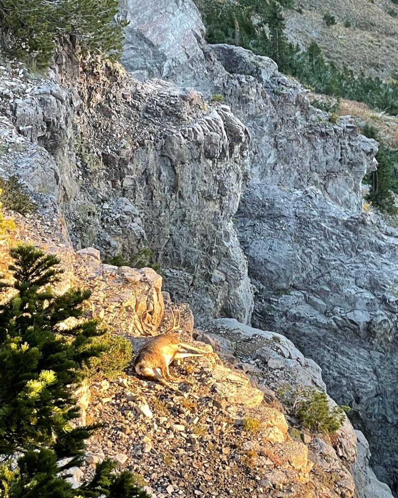 “I shot the deer above some cliffs in a grassy feeding area. The buck fell and landed on a ledge right on the edge of the cliff. So, I set up my tent and settled in with a big fire, not wanting to be on the cliff as it got dark. In the dark, I planned to get to the buck through the ribbon cliffs and get him quartered. After quartering the buck, I loaded him up in my pack, and started to pick my way across the other end of the cliff. When I made it down safely, I loaded up my camp and the whole deer and hiked the couple miles back to my rig.”