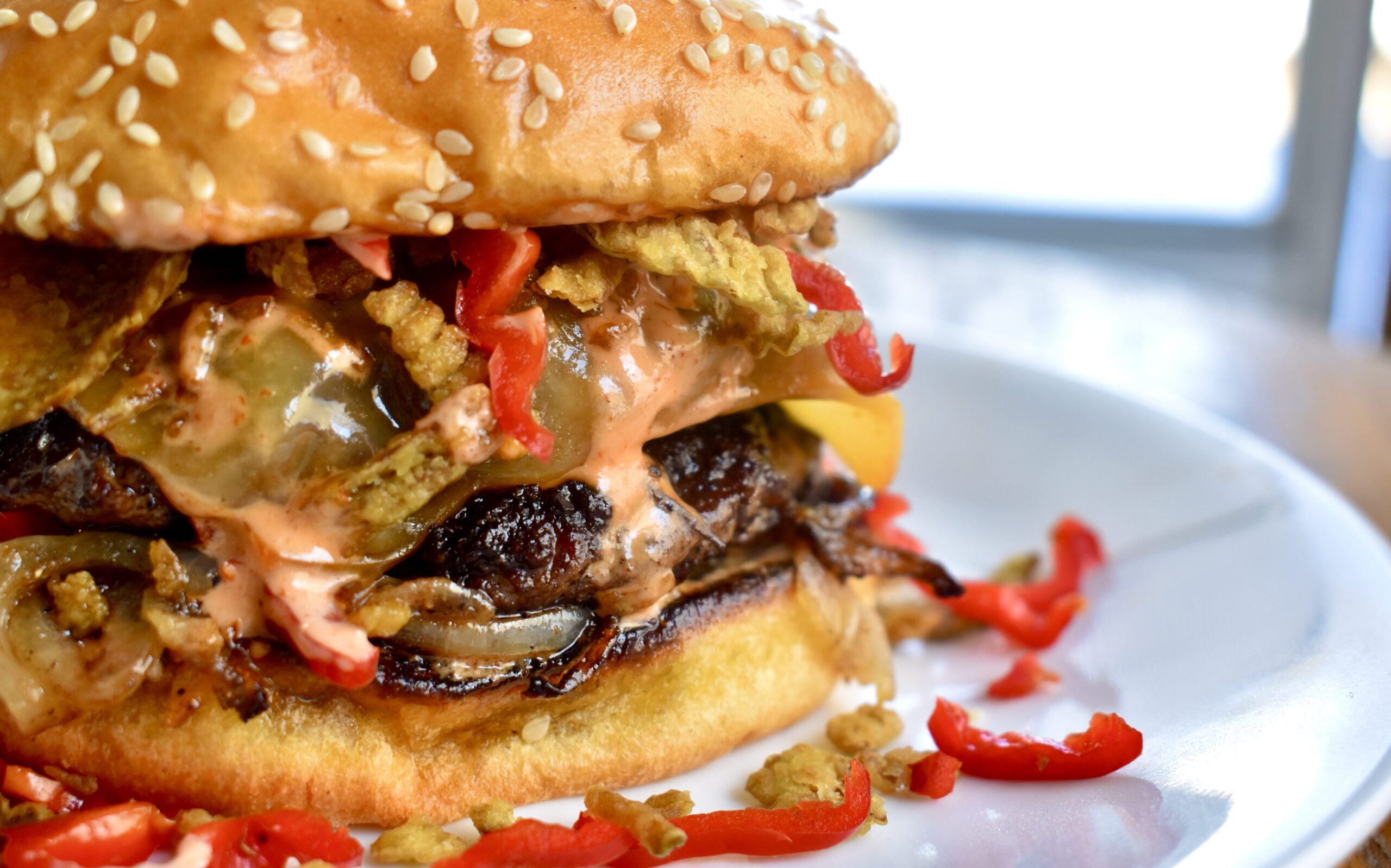 Toast the buns, then slather the spicy mayo on both sides. Split the onions between the buns, laying them down on the bottoms, then put two patties (one with cheese) on each bun. Top with the chopped chilis and crispy jalapenos, then close the buns. Serve immediately… maybe with a tall glass of cold milk! Enjoy!