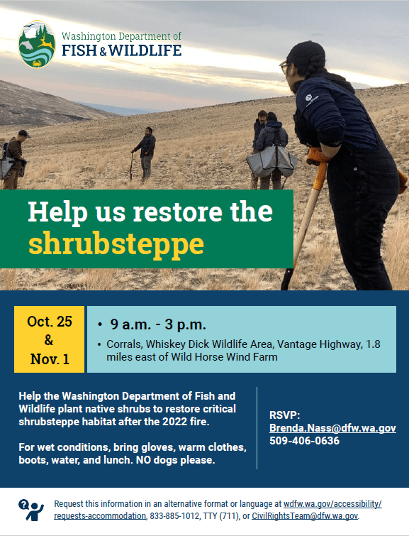 MDF local chapters have contributed funding to assist the WDFW in the purchase of native shrub (sage and bitterbrush) plugs and we invite you to get your boots on and hands dirty to help us get them in the ground! These efforts will help to restore the Shrub Steppe ecosystem and mule deer winter range on LT Murray WMA in the Whiskey Dick WLA after the 2022 Vantage Fire that burned over 30,000 acres of critical habitat.