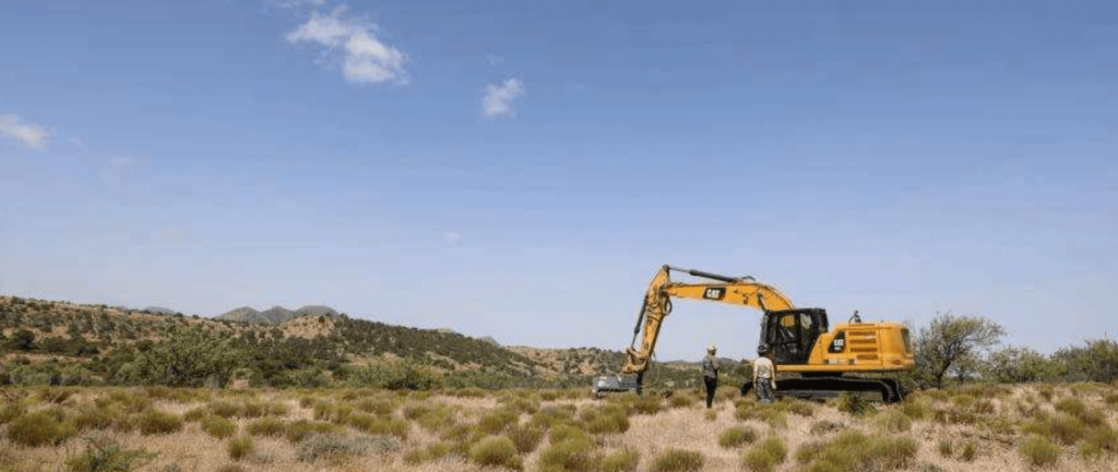Excavator working in a desert habitat for conservation efforts.