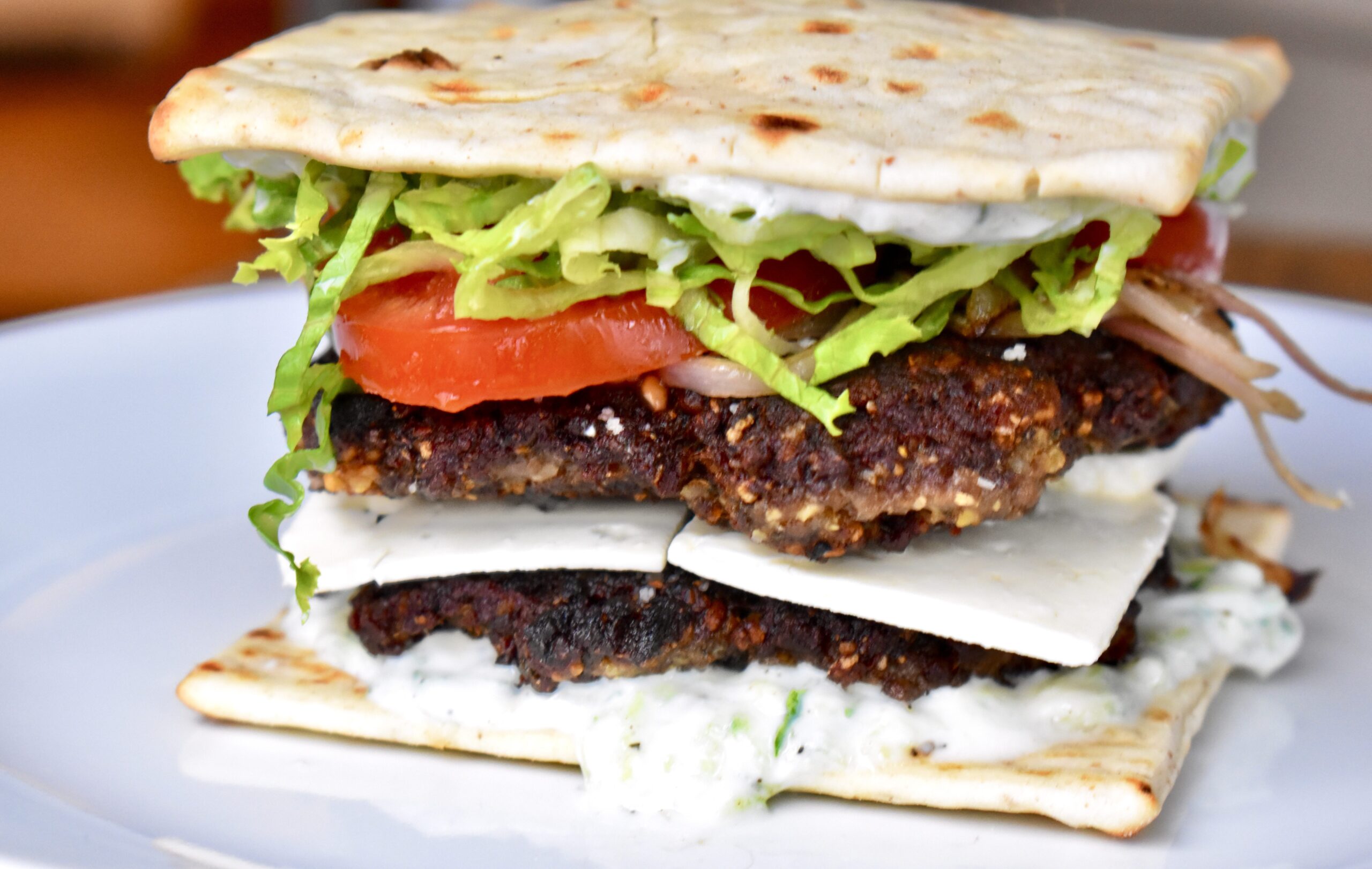 Warm the pita or buns, then build the sandwiches by spreading tzatziki on both bottoms and tops, then adding the patties, feta cheese, grilled onions, lettuce, and tomatoes. Enjoy!