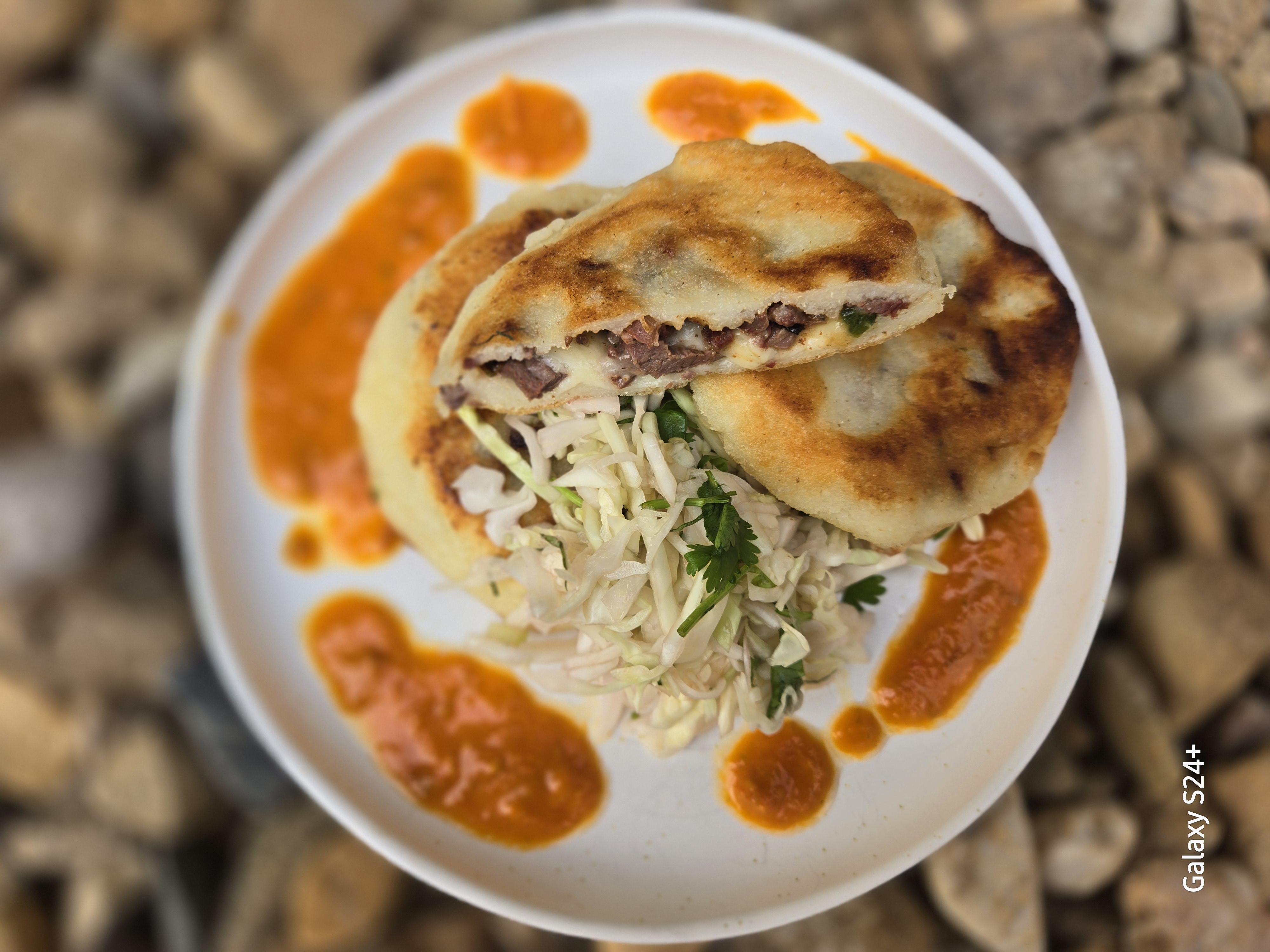 Delicious pupusa served with salad and sauce on a plate.
