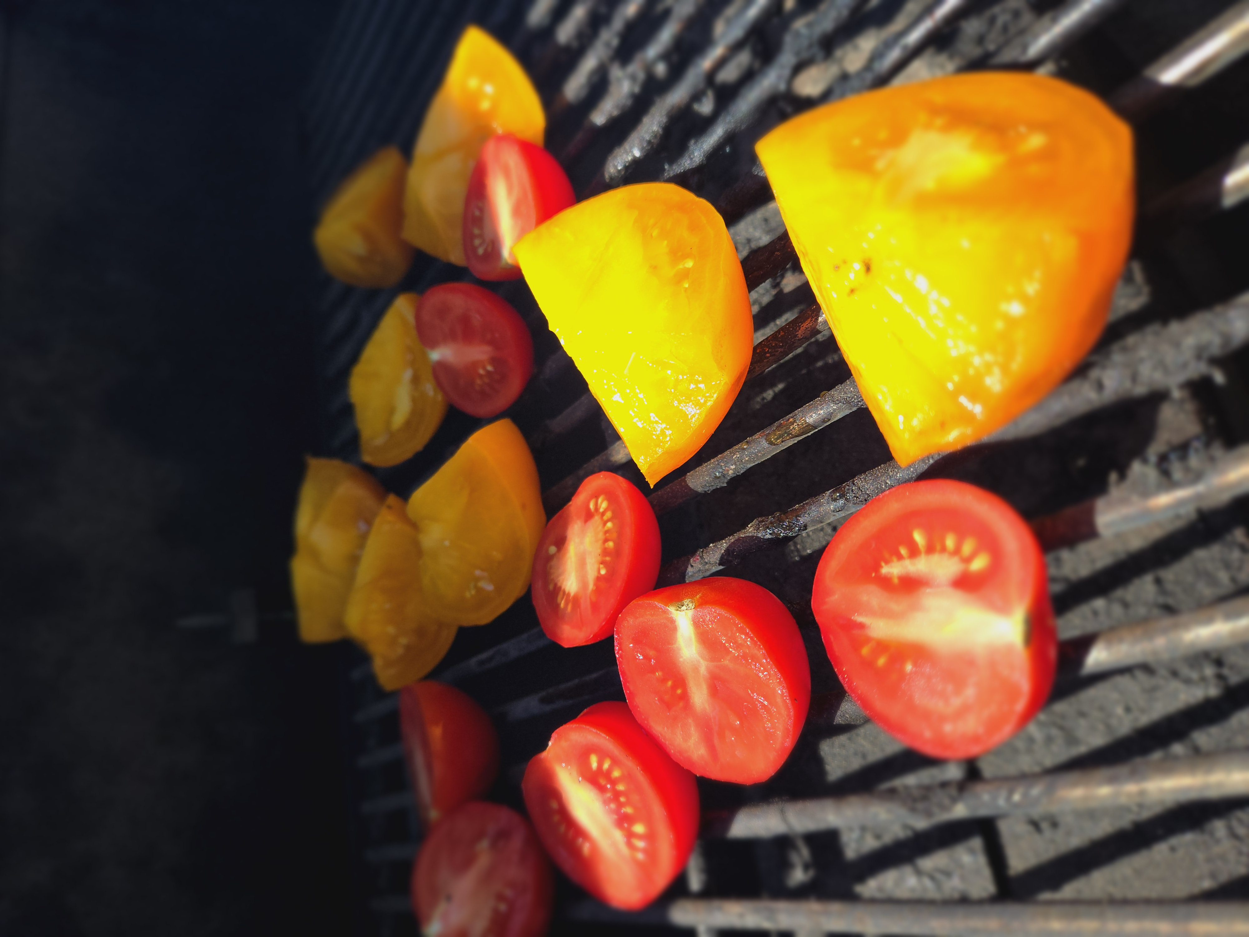 1. Cut the tomatoes into large chunks, and toss in olive  oil just to coat. Smoke the tomatoes for 2 hours at 180 Deg. I use a food processor to get the tomatoes to the desired consistency before adding the garlic, honey, lime juice, and red wine vinegar.