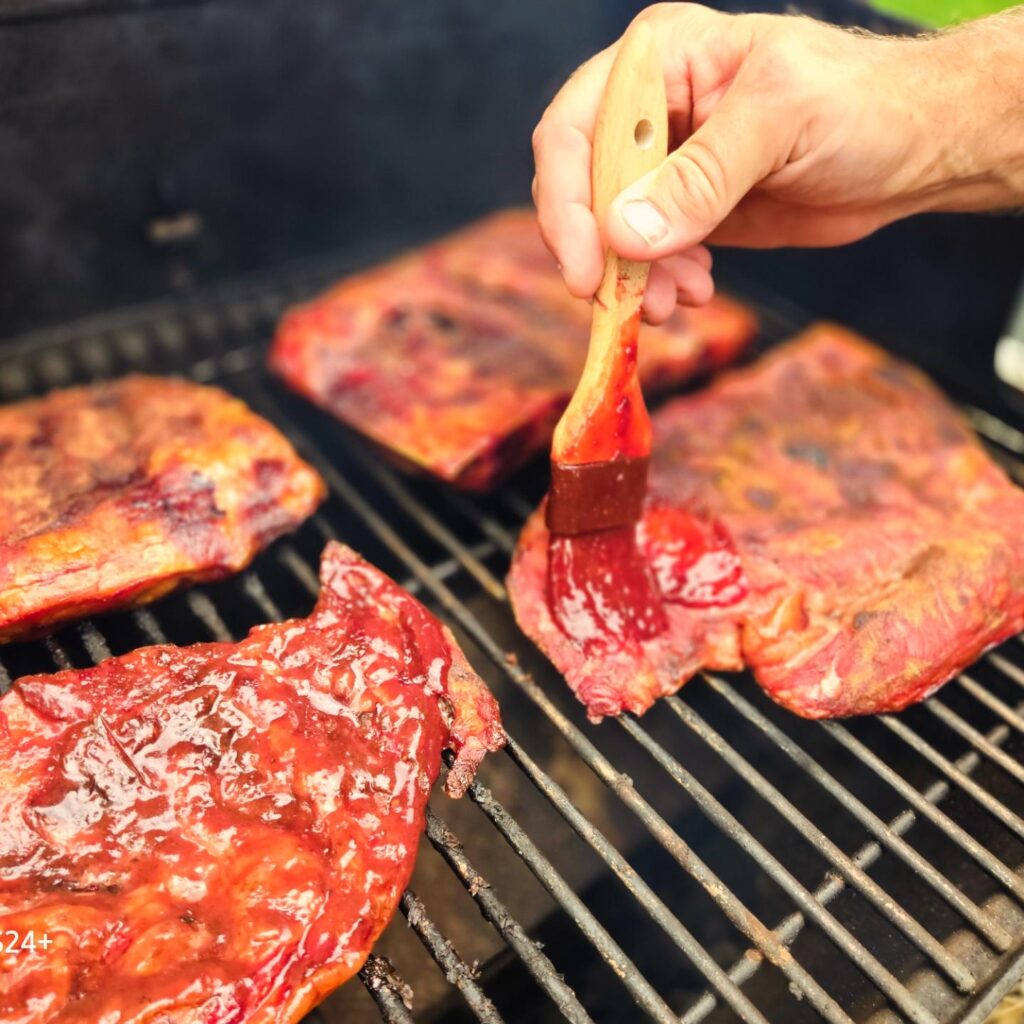• Remove the ribs from the refrigerator and allow them to come up in temperature for about 15 minutes.  Brush a LIGHT glaze on all sides of the ribs and set aside.