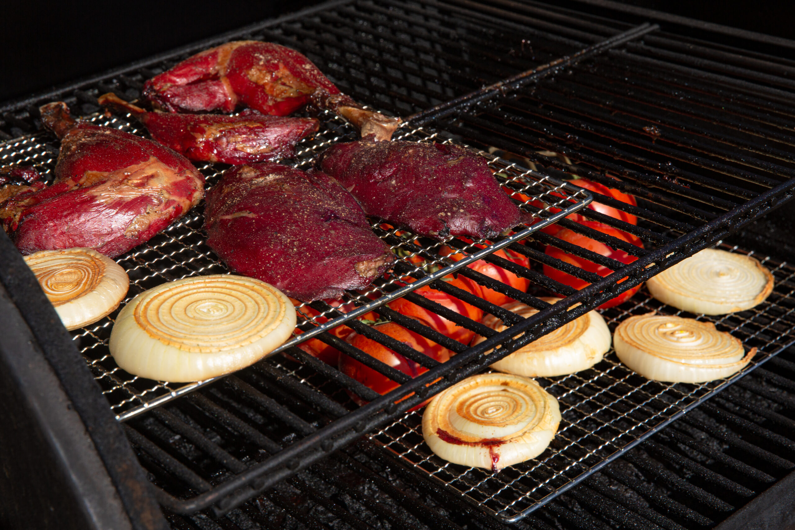 1. Lightly salt and pepper all Canada goose cuts. Slice medium onion into 3-4 rings and lightly oil tomatoes with olive oil. Smoke Canada goose cuts, tomatoes, and onion slices for 2 hours at 200 degrees Fahrenheit.