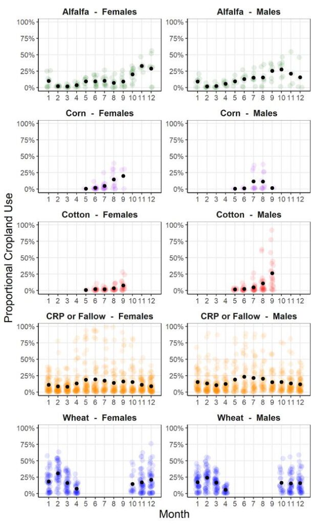 Average annual home range size was 10,000 acres for males and 2,500 acres for females and did not seem to be influenced by agriculture. Mule deer that lived greater than 2.5 miles from cropland did not use agriculture demonstrating that mule deer do not travel great distances to access this forage source. Overall, our collected movement data demonstrated that mule deer spend an average of 3-14% of their time in cropland. The percentage of time mule deer spend in agriculture, however, will vary depending on the time of year and crop species available to them. Our habitat selection models revealed a similar pattern where mule deer were placing their home ranges in areas closer to cropland from January to March for both sexes.