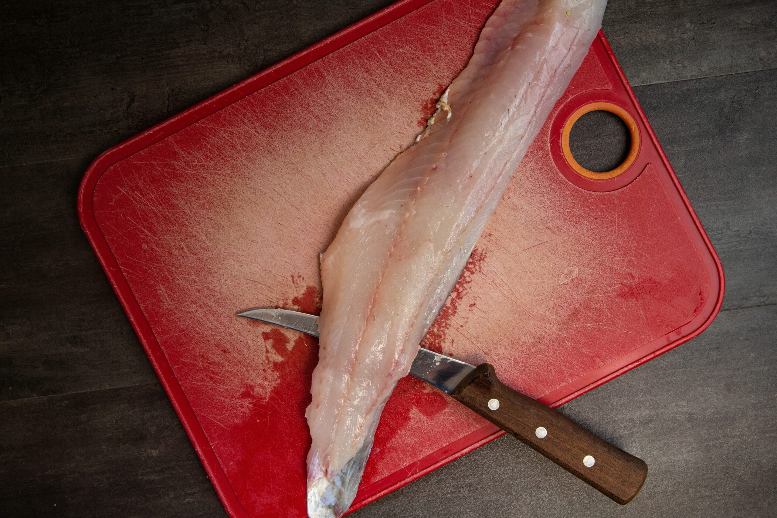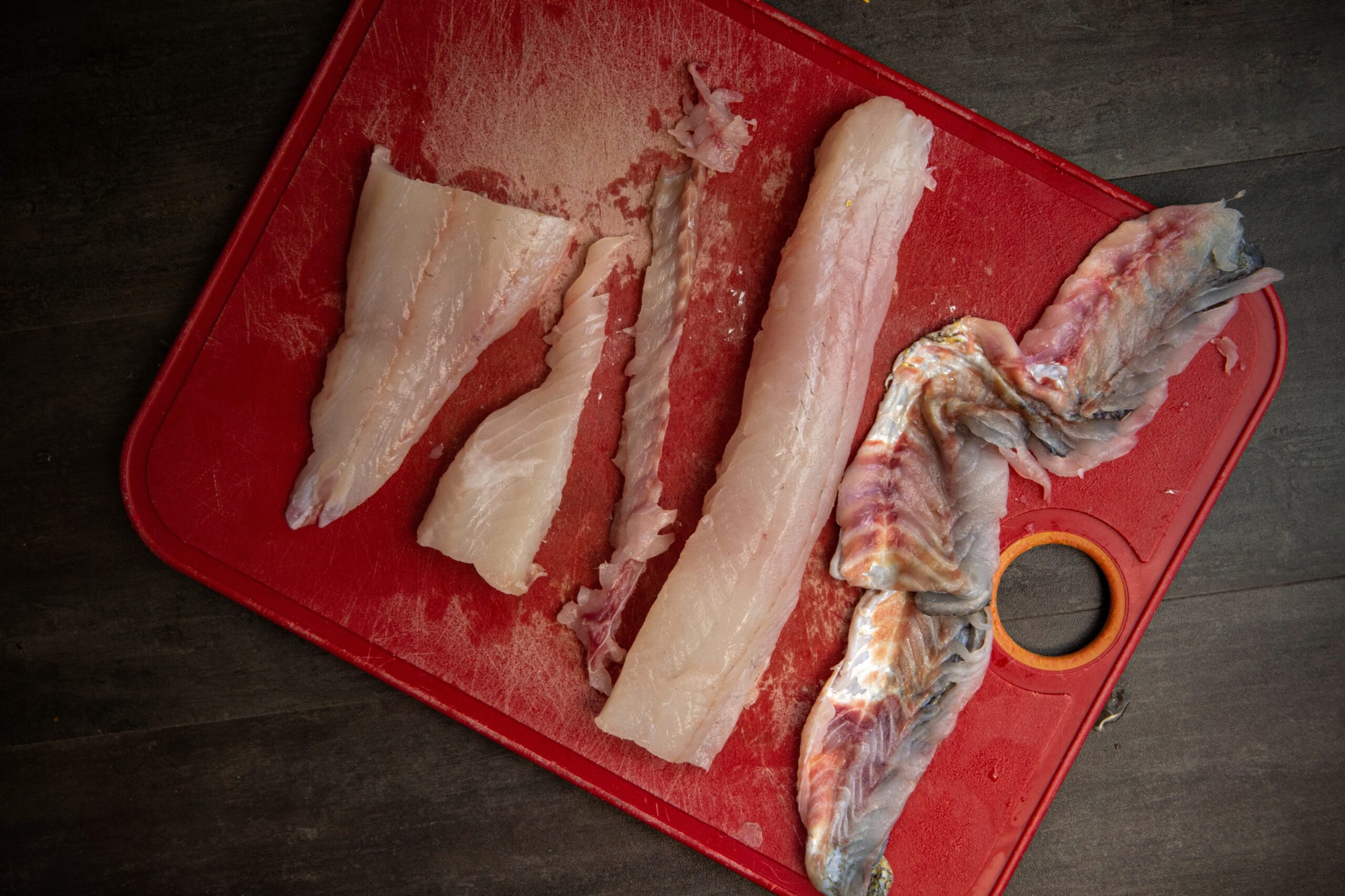 If making this sandwich from a fresh catch, you will want to remove the meat from the skin. To do so, take a very sharp fillet knife and make a cut toward the tail-end of the fillet, separating enough flesh from skin that you can grip the skin. Next, angle the knife downward at 15-20 degrees and using your grip on the skin, pull the rest of the fillet toward you while you work the knife gently back and form. You pulling the fish fillet toward you, with the knife angled down, is doing most of the work for removing the meat (versus taking the knife up the fillet).