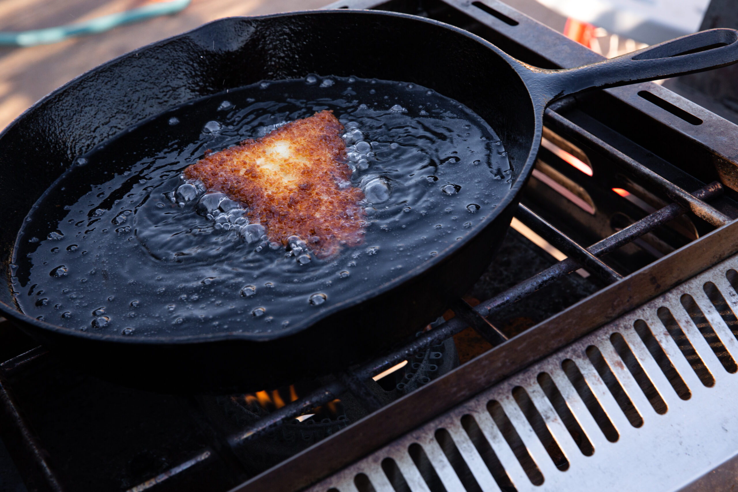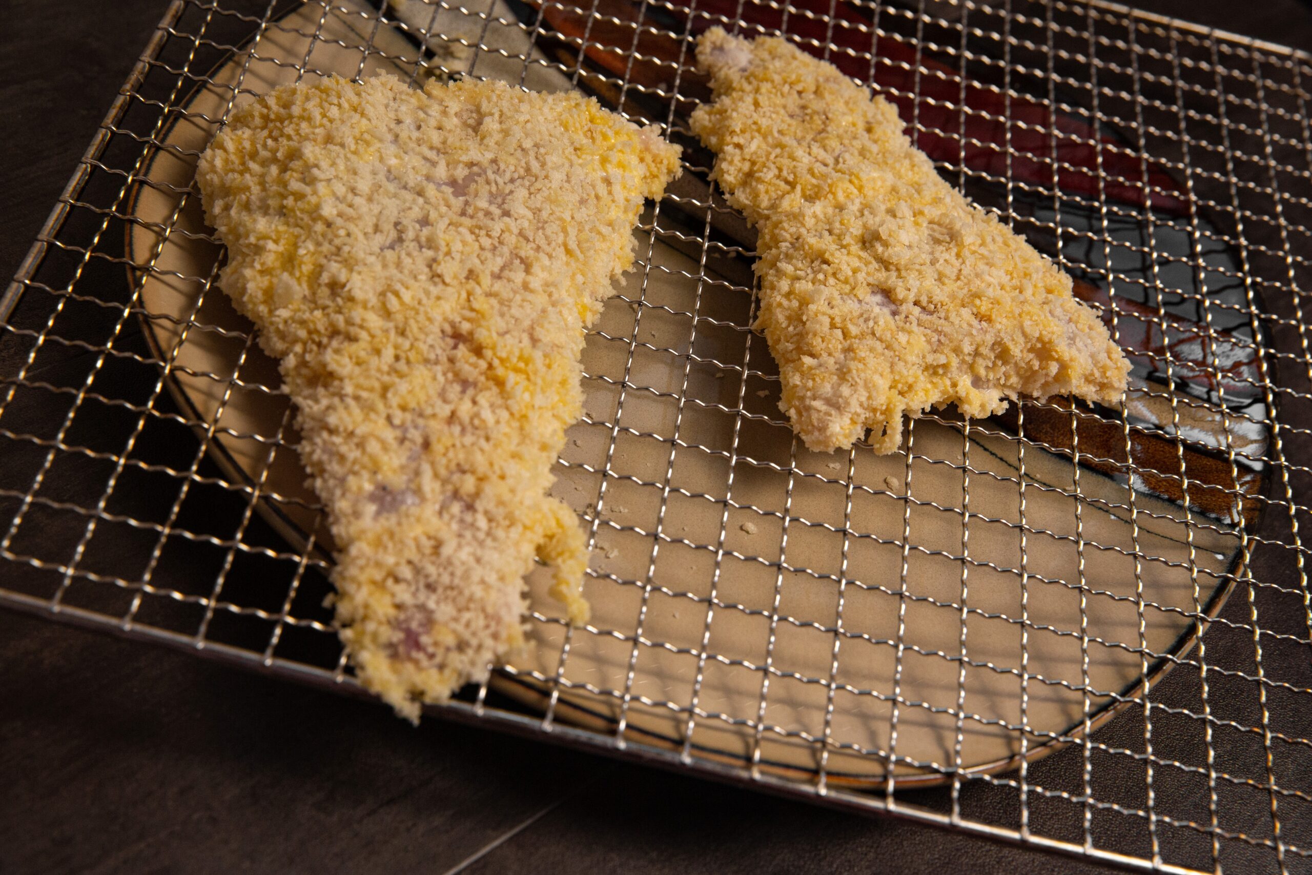The process is as follows: Pull your fillets from the buttermilk, toss in the flour-and-cornstarch mix, add to egg wash, then lastly coat in panko bread crumbs before adding to the hot oil.