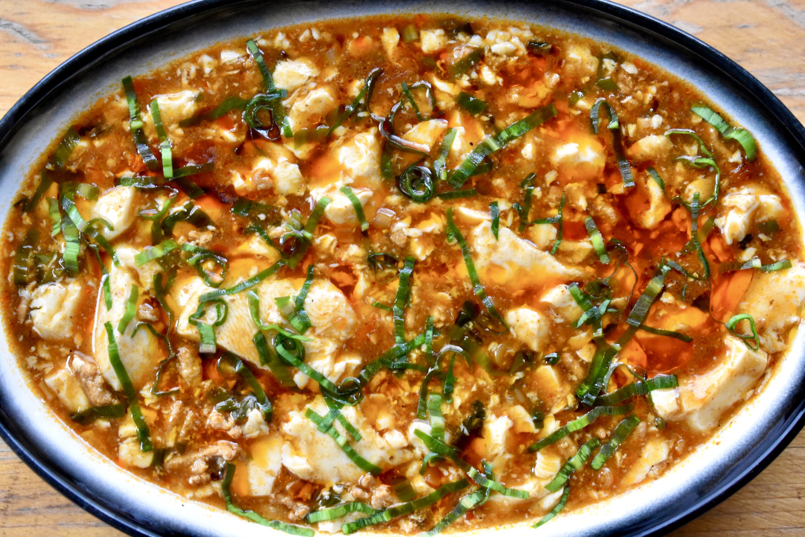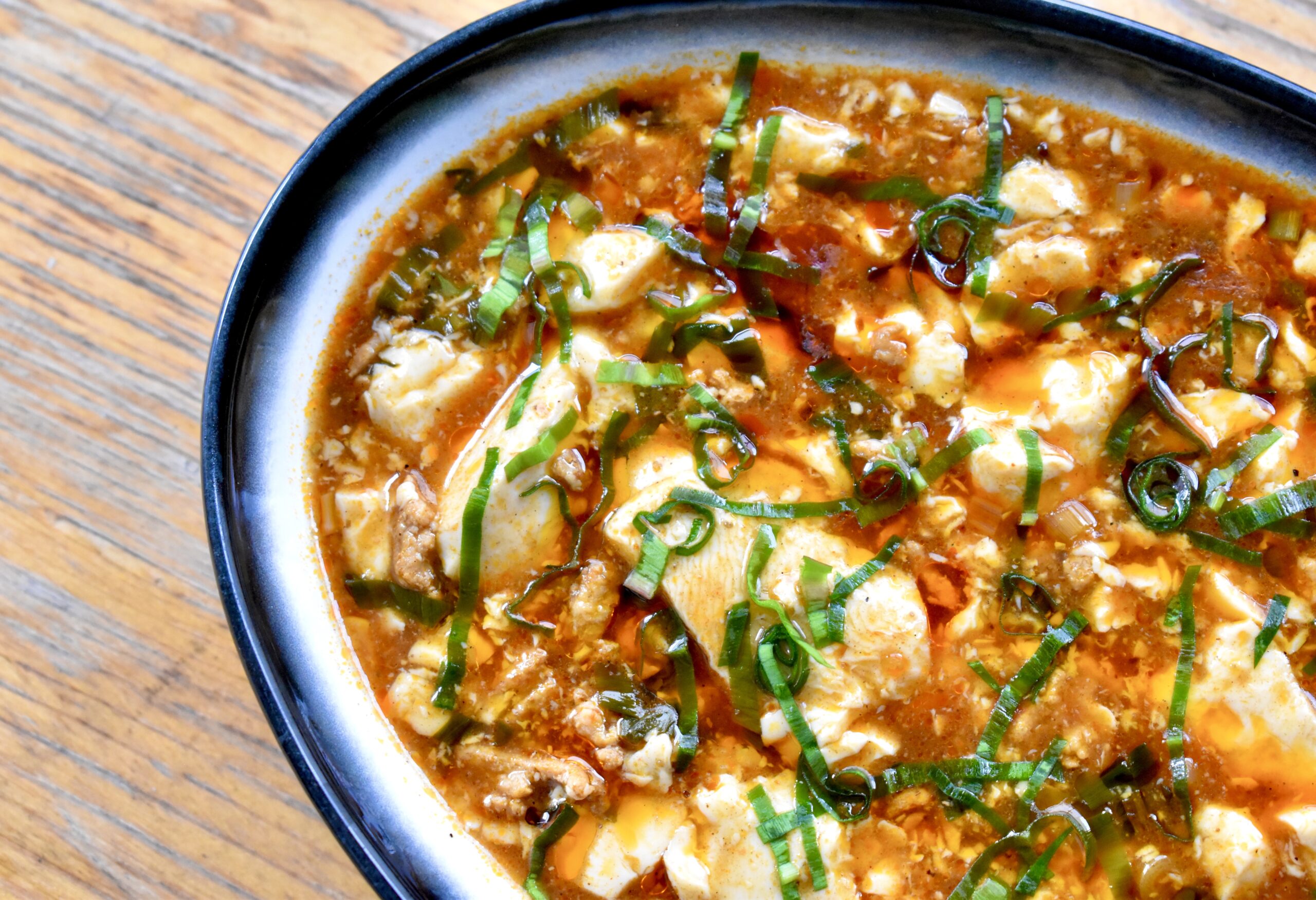 Cook for 1 minute, then add the water or stock. Bring to a simmer and gently add the tofu and chili oil. Break the tofu into large-ish pieces with the spoon. Gently simmer for 10 minutes, pushing rather than stirring to avoid breaking the tofu up.