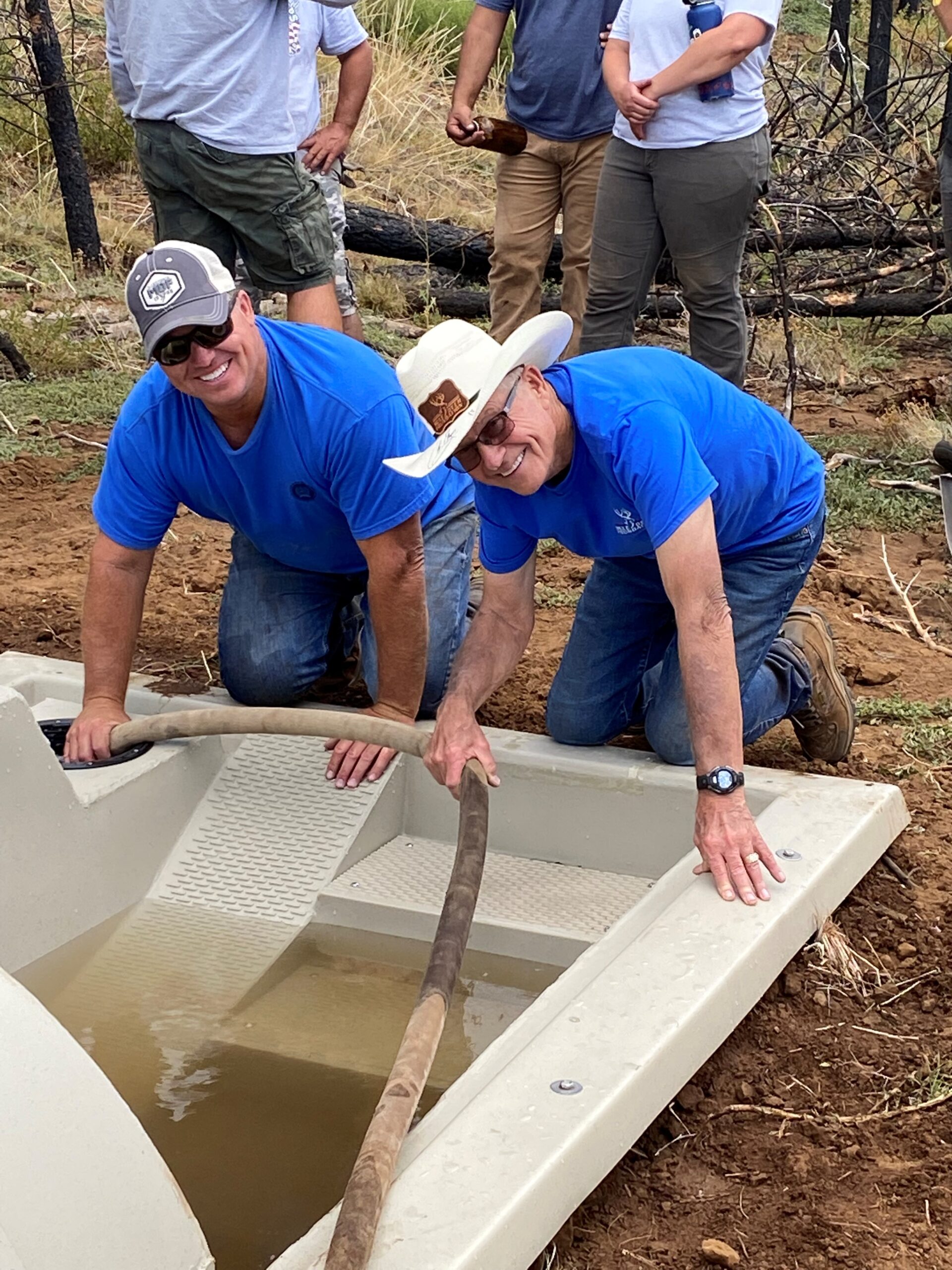 MDF Founder Emmett Burroughs and his son filling the guzzler after installation.